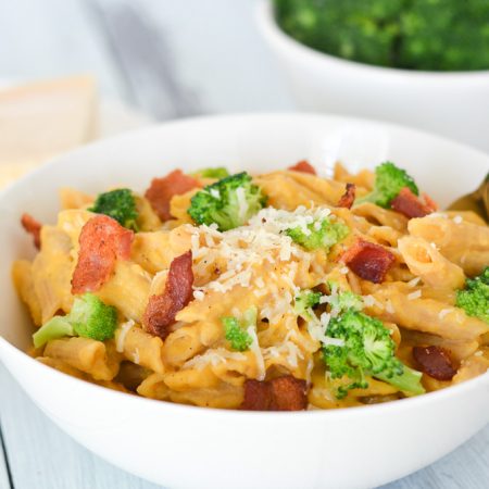 This Creamy Butternut Squash Penne with Bacon and Broccoli is packed full of veggies, and the perfect balance of savory and sweet. It's a perfect fall meal for the whole family!